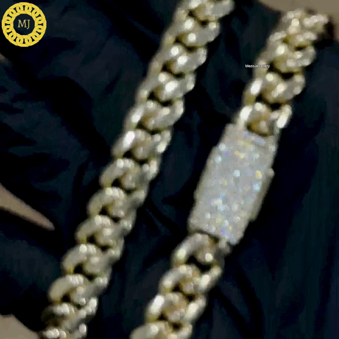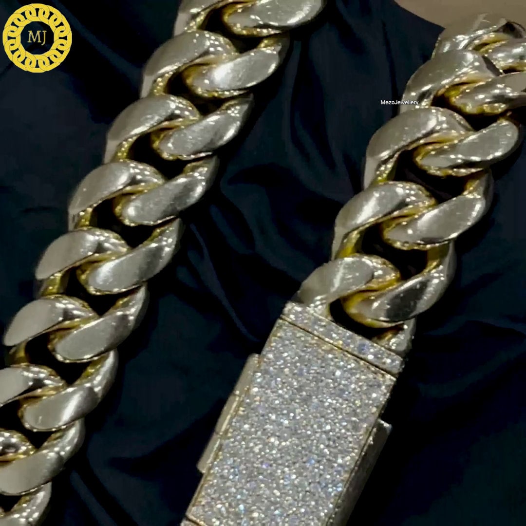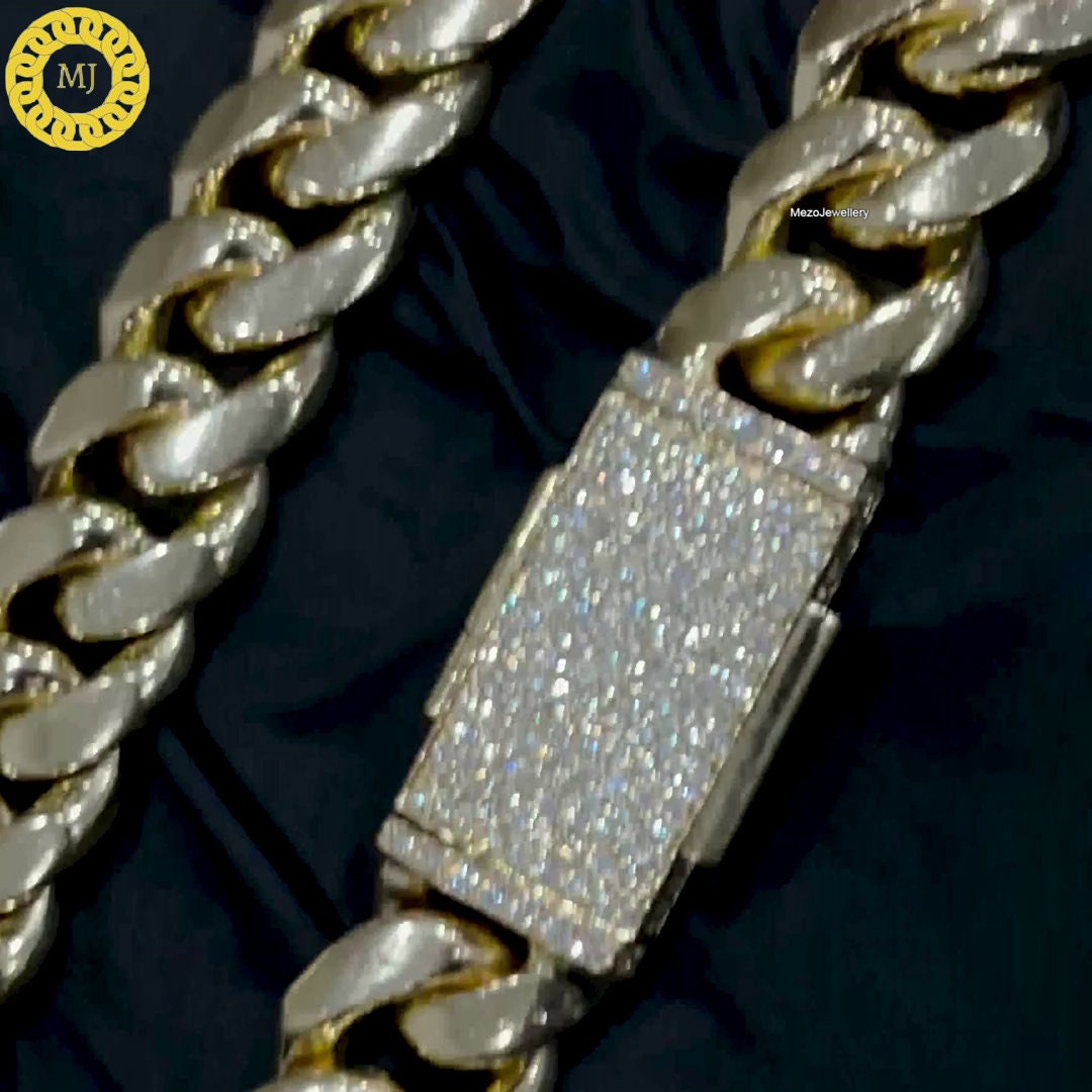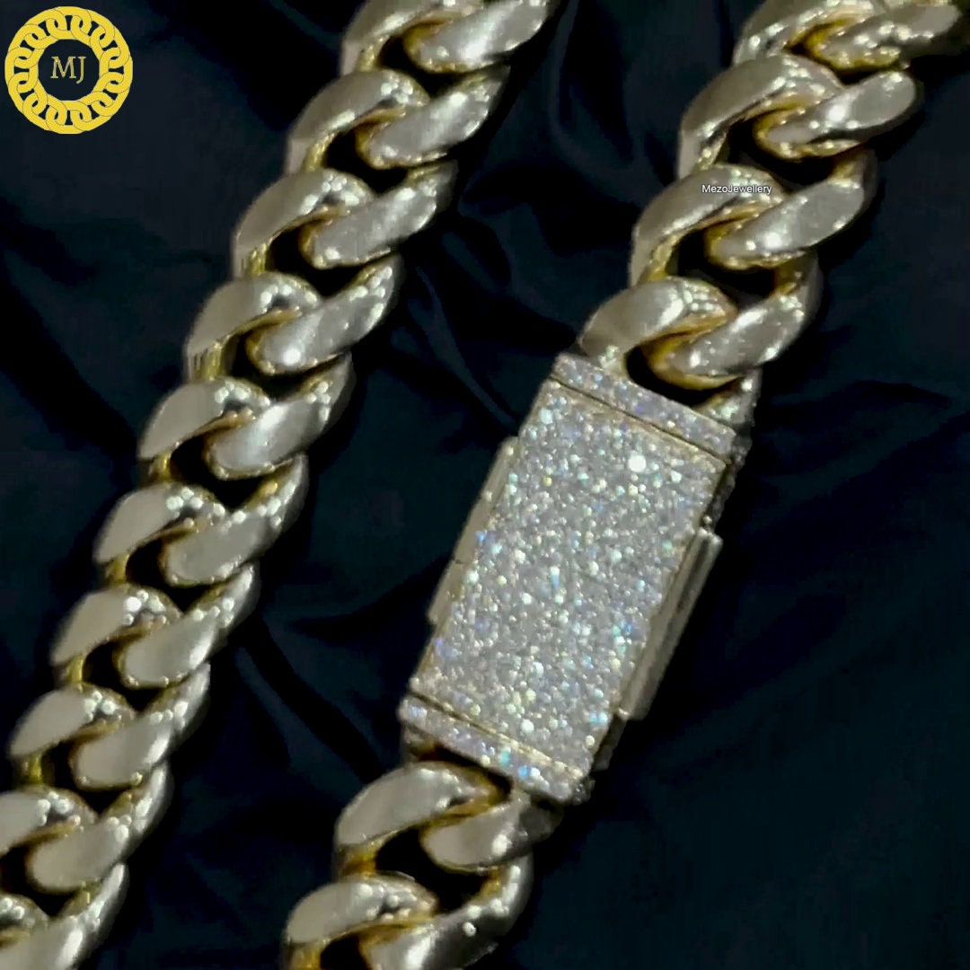 Miami cuban link is classcial style in streetwear fashoin. Iced out clasp with miami cuban link, it will be indispensable in your daily wear. This chain is silver cuban chain with moissanite clasp