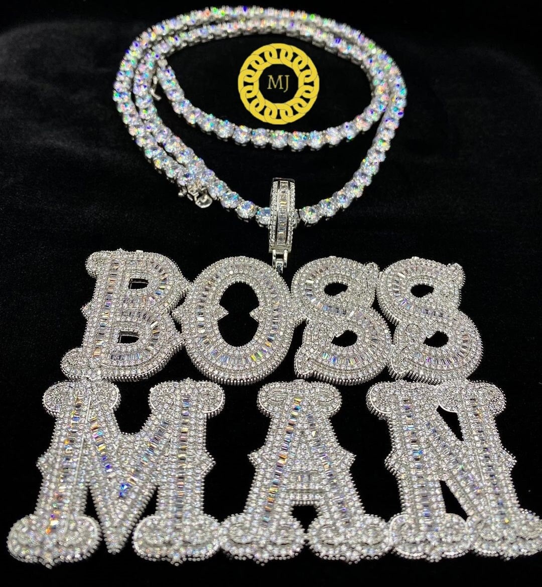 14K Gold Finish Boss Man Hip Hop Pendant, CUSTOMIZED Moissanite Baguette Letters Pendant,Custom Iced Out icy Baguette ,Passing any Tester