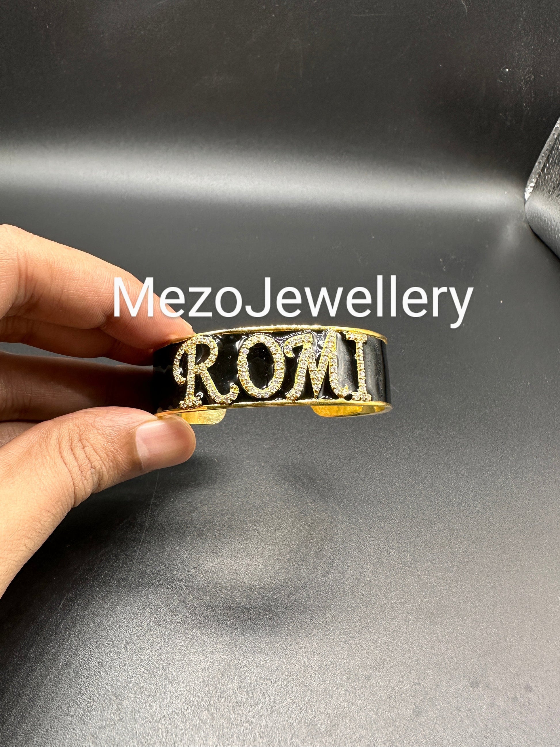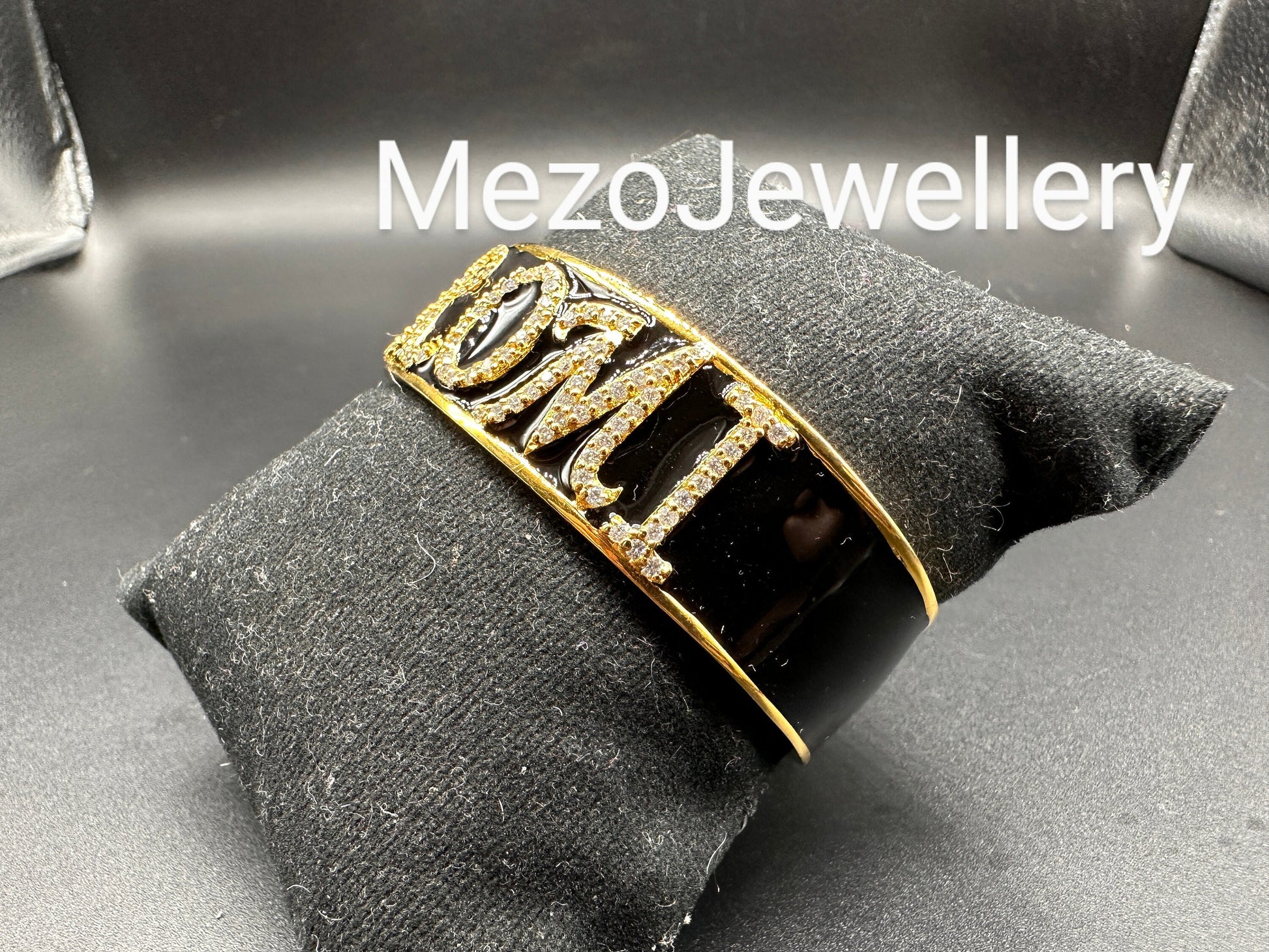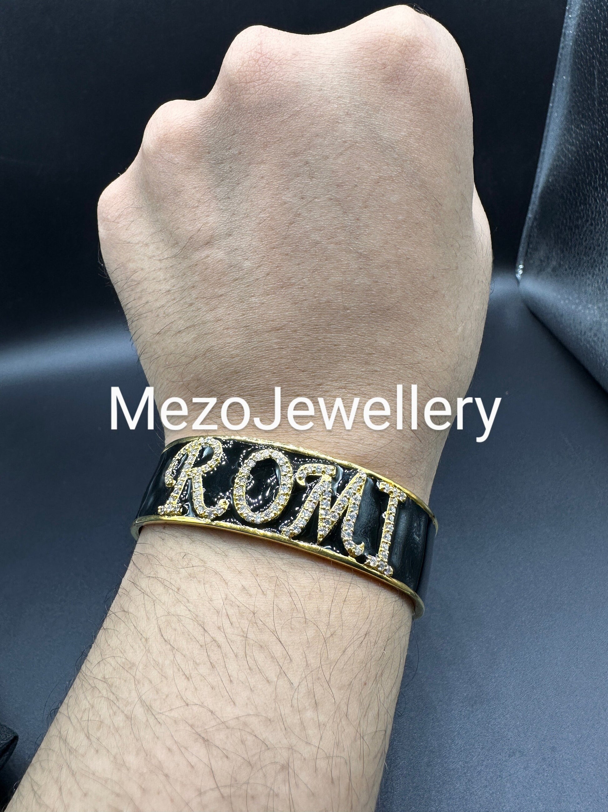 18ct Gold Custom Initial Bracelet, 925 Silver Personalised Enamel Handmade With Names, Heavy Bangle, Birthday Birthday, Valentines gift VVS clarity. D Color. LOOKS JUST LIKE NATURAL DIAMONDS PASSES DIAMOND TESTER Both pen & basic Xray tester Solid 925 sterling silver, 20mm width bangle 6 ",7" , 8"and 9" lengths available Moissanite all micropaved and set by hand!!! Super ICY, shines brighter than real diamonds!!! Will never turn your hand green or tarnish Matching chains available. All GRA certified -Free Express delivery Let us know if you have any questions! Mezo jewelery Why to choose us? $handmade jewelery from scratch to finish $we use 100% renewal source of energy. $no carbon emission while making the jewelery. $My jewelery is DURABLE and PERFECT because it goes under 20 quality checks before delivery. Less carbon footprint on earth and more shine on your jewelery.
