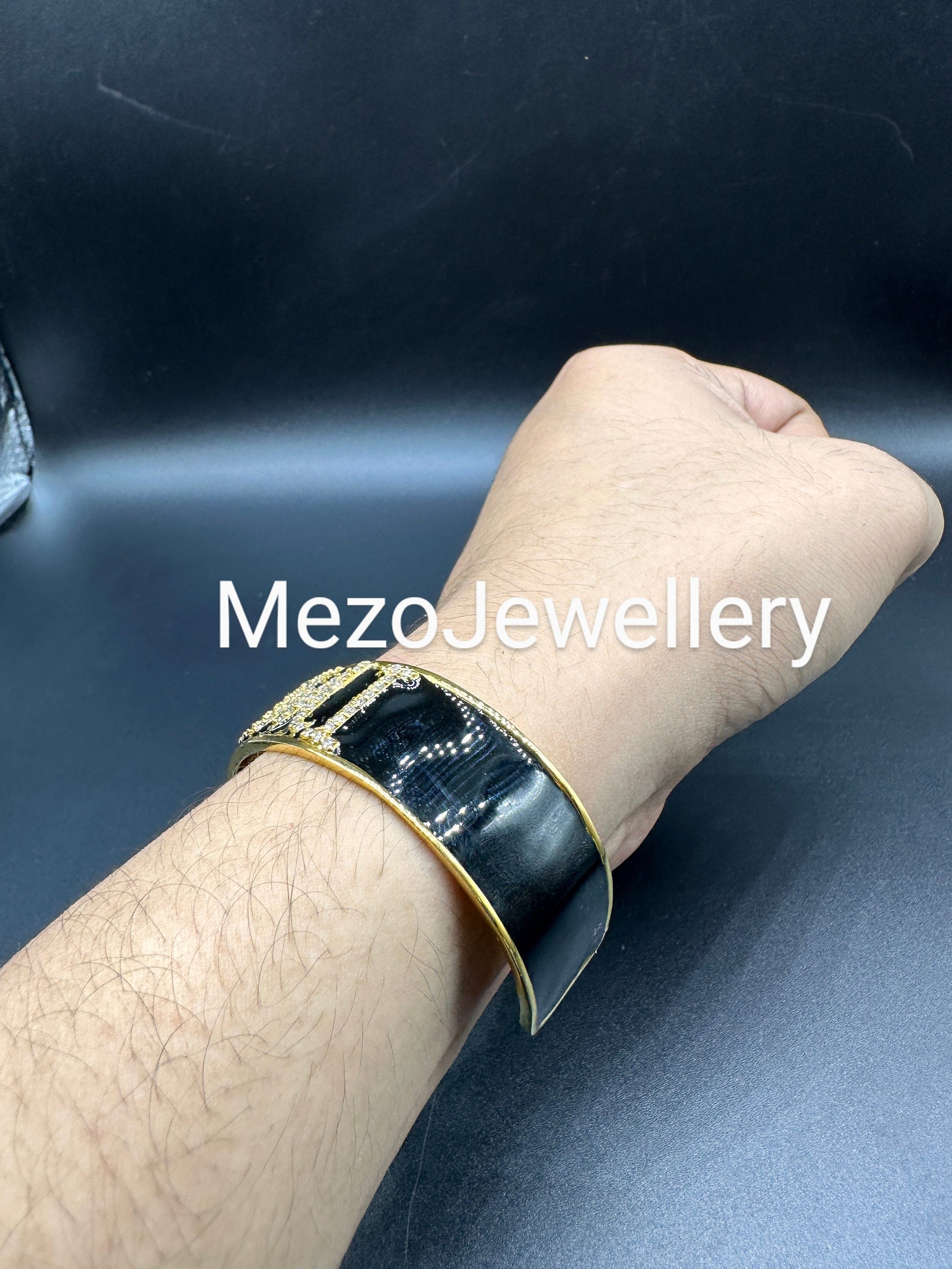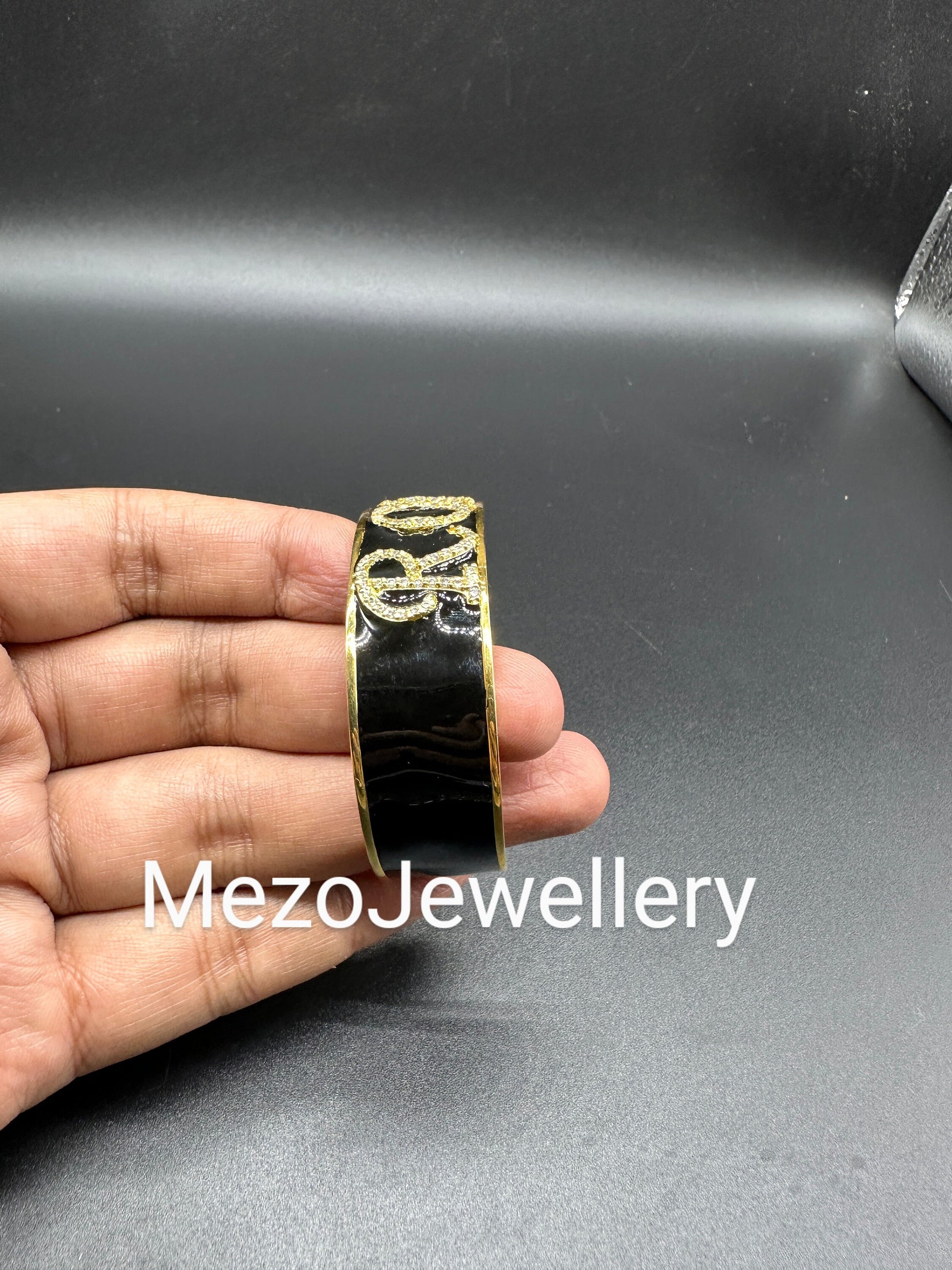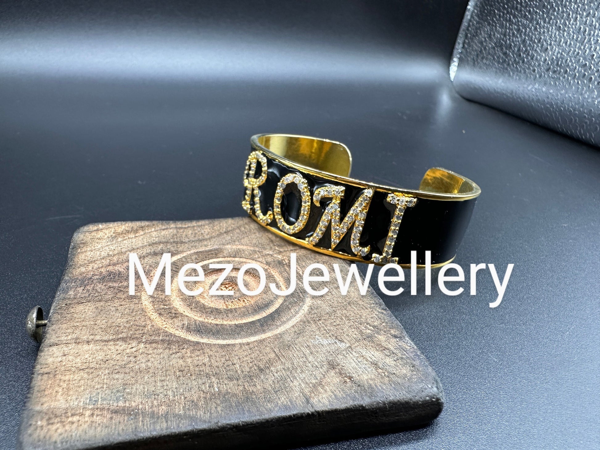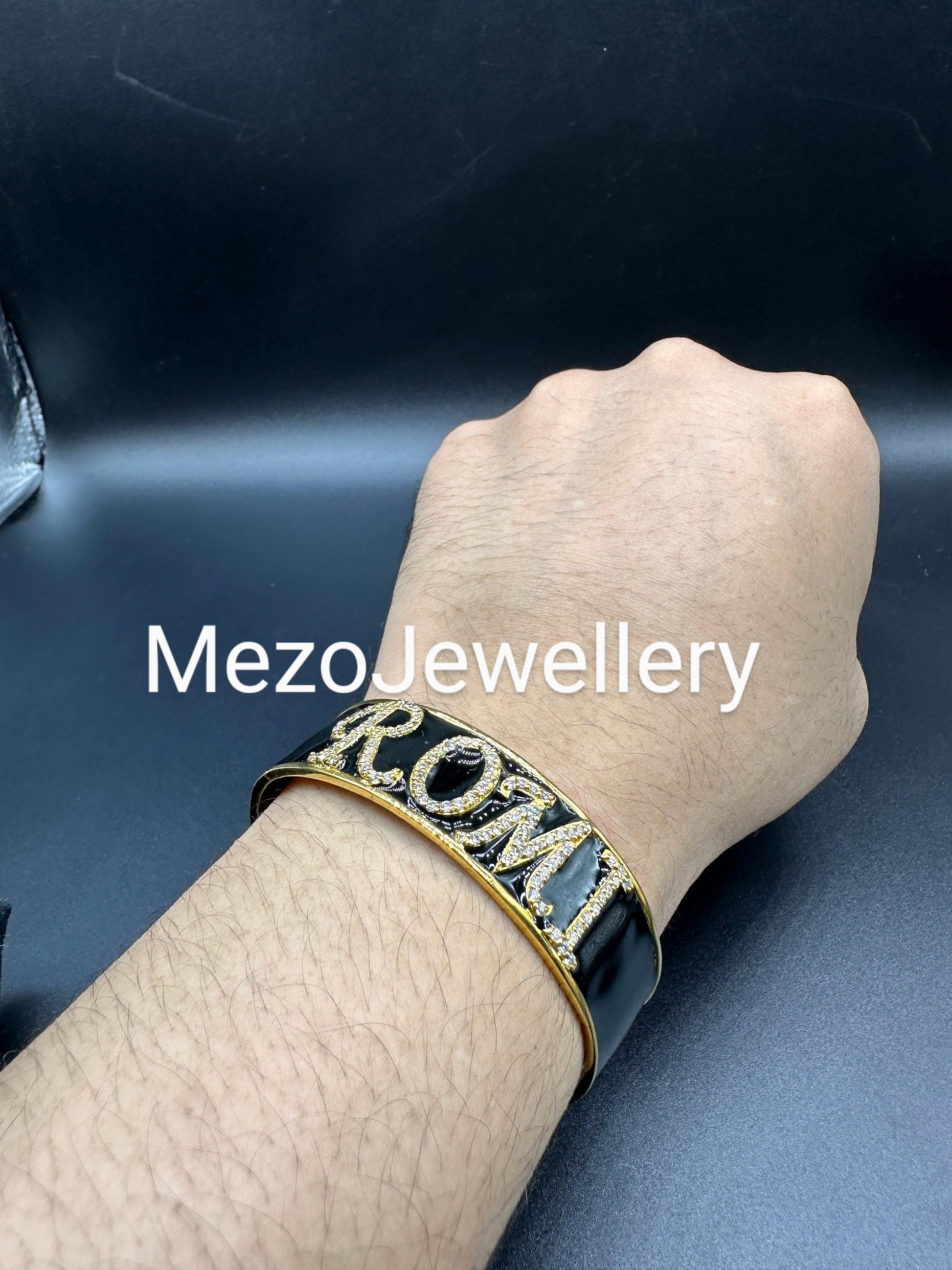 18ct Gold Custom Initial Bracelet, 925 Silver Personalised Enamel Handmade With Names, Heavy Bangle, Birthday Birthday, Valentines gift VVS clarity. D Color. LOOKS JUST LIKE NATURAL DIAMONDS PASSES DIAMOND TESTER Both pen & basic Xray tester Solid 925 sterling silver, 20mm width bangle 6 ",7" , 8"and 9" lengths available Moissanite all micropaved and set by hand!!! Super ICY, shines brighter than real diamonds!!! Will never turn your hand green or tarnish Matching chains available. All GRA certified -Free Express delivery Let us know if you have any questions! Mezo jewelery Why to choose us? $handmade jewelery from scratch to finish $we use 100% renewal source of energy. $no carbon emission while making the jewelery. $My jewelery is DURABLE and PERFECT because it goes under 20 quality checks before delivery. Less carbon footprint on earth and more shine on your jewelery.