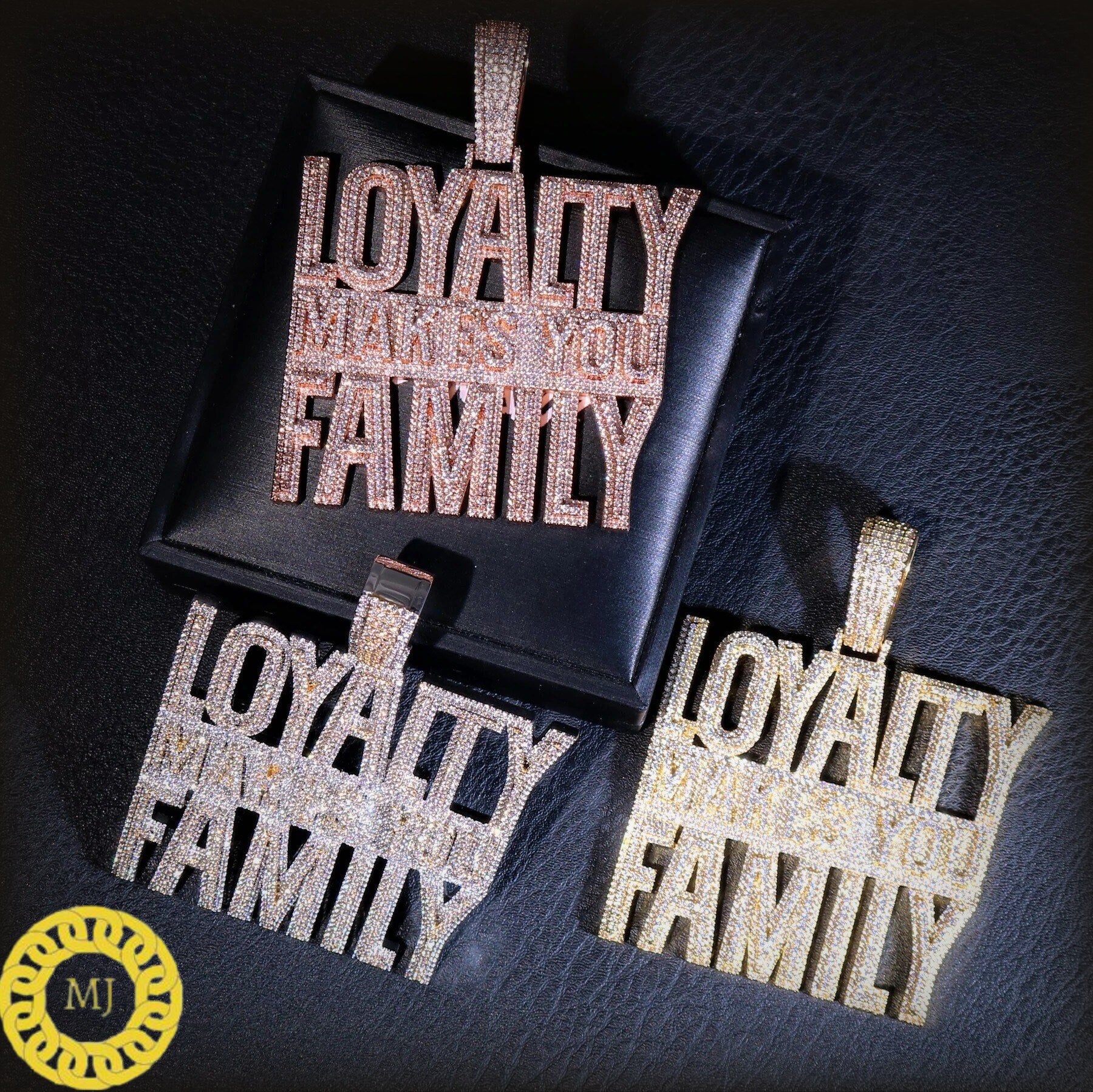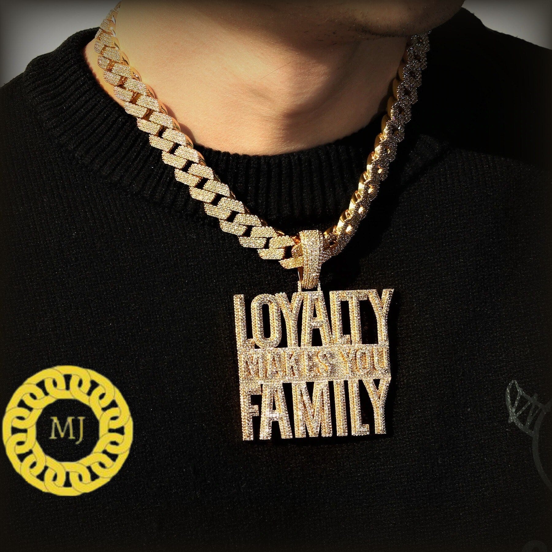 Full Iced loyalty Makes You Family Necklace , 14k Gold Finish Loyalty Makes You Family Hip Hop Charm Pendant in 925 silver w/ Rope Chain
