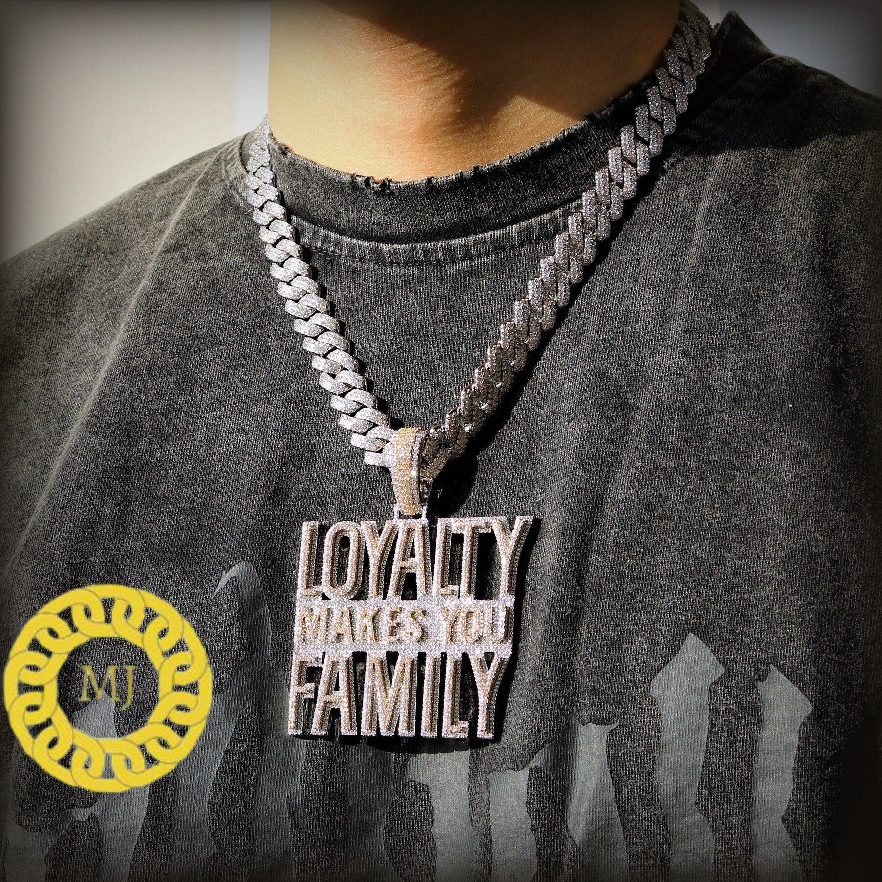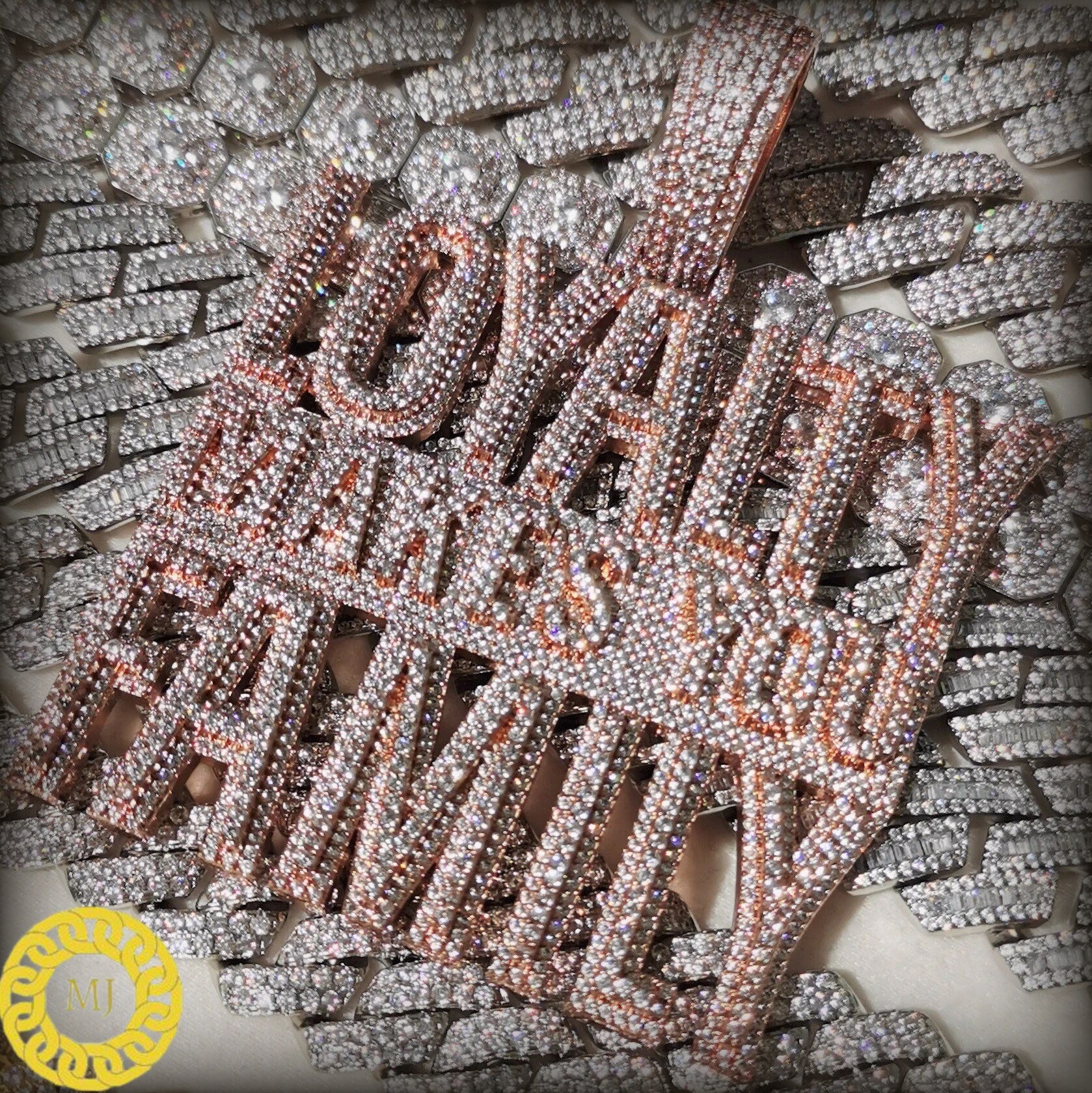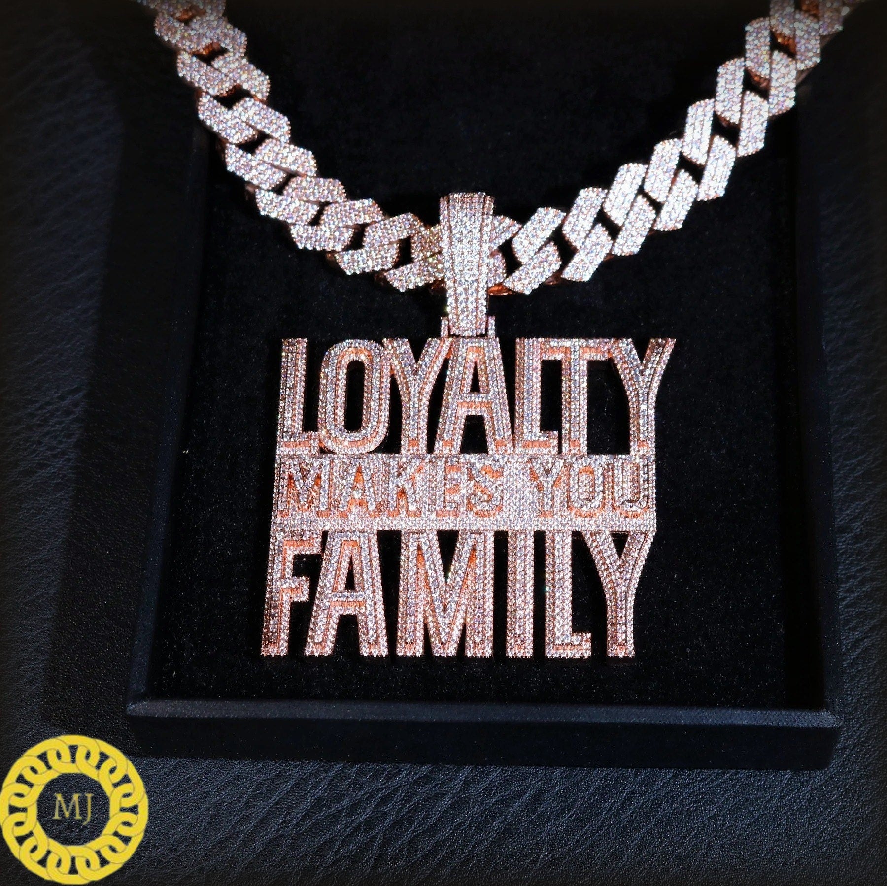 Full Icedout loyalty Makes You Family Necklace , 14k Gold Finish Moissanite Diamond Hip Hop Charm Pendant in 925 silver w/ Rope Chain,