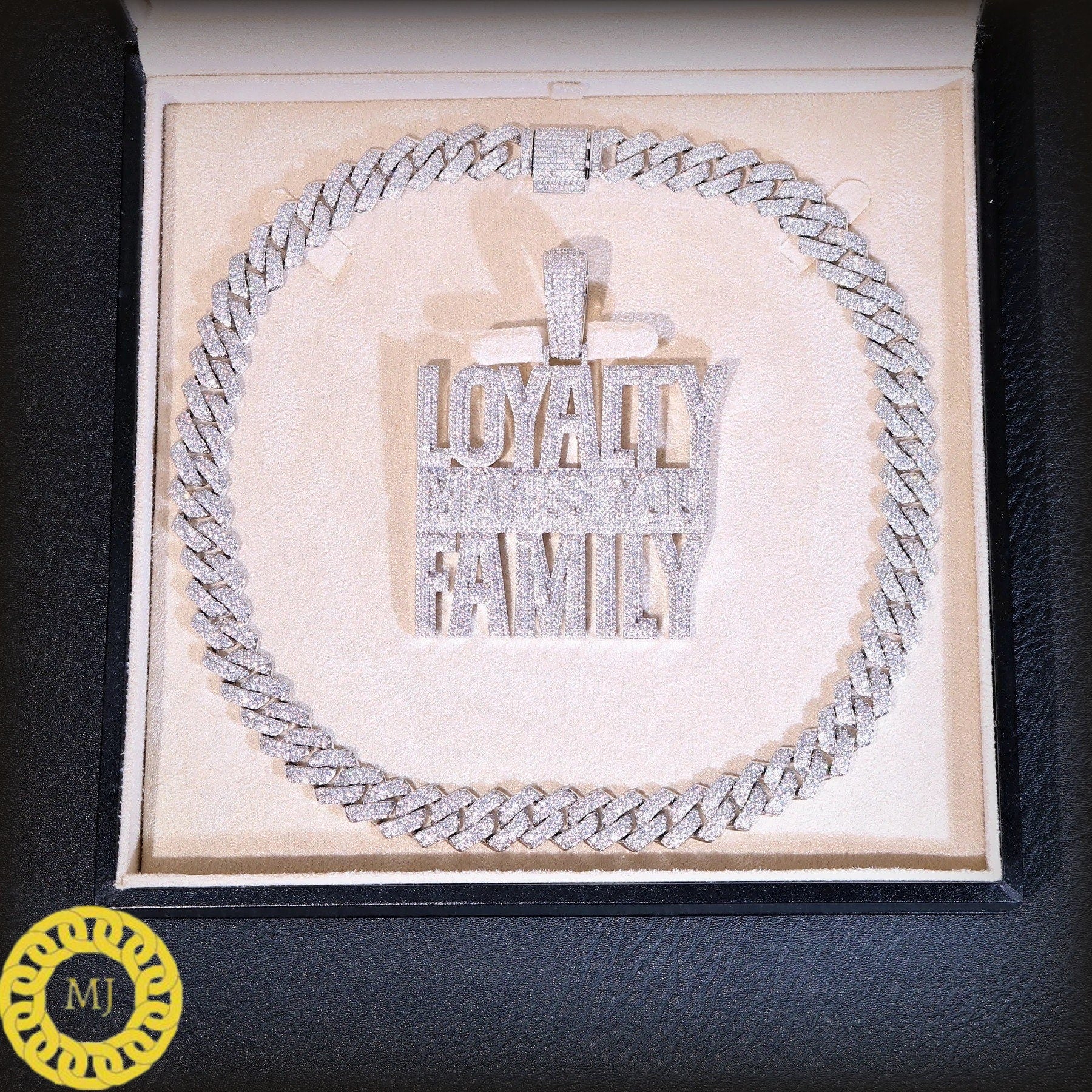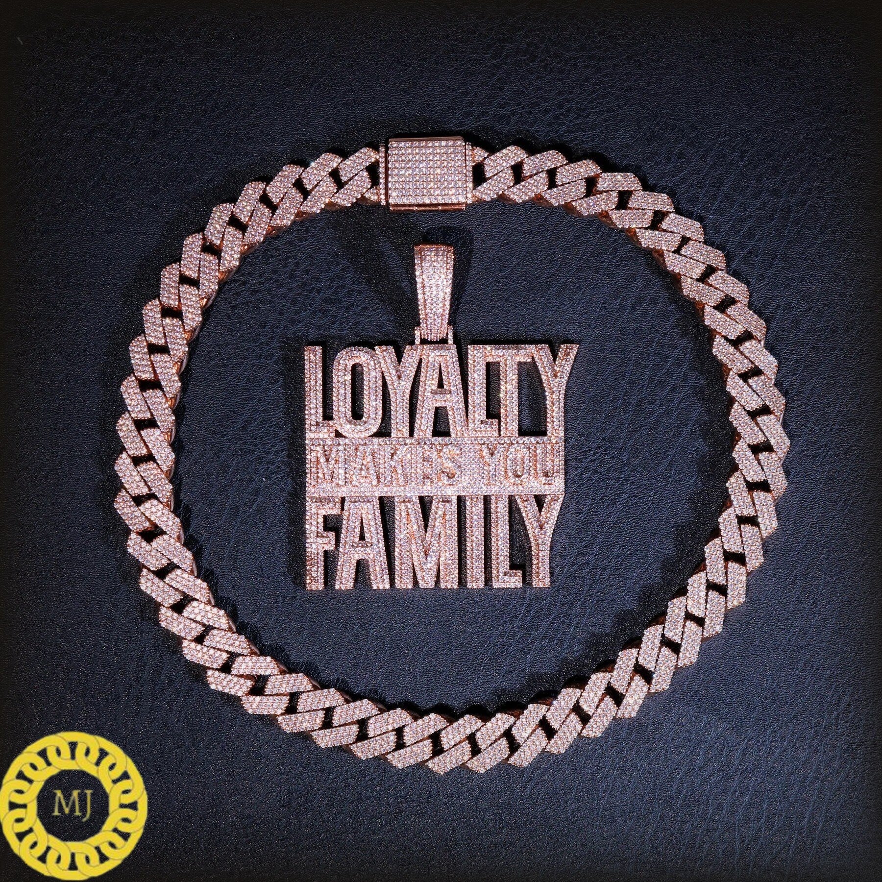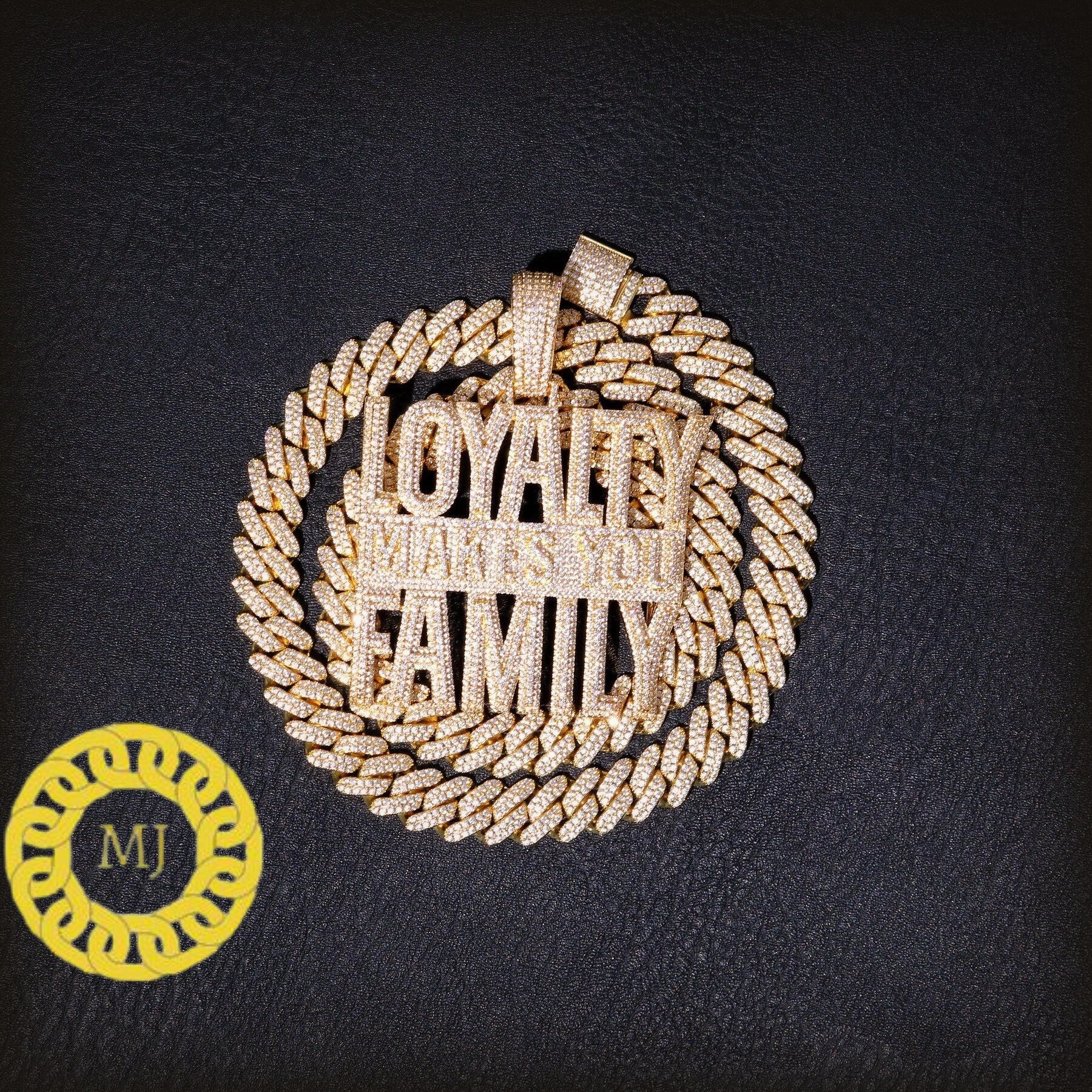 Full Icedout loyalty Makes You Family Necklace , 14k Gold Finish Moissanite Diamond Hip Hop Charm Pendant in 925 silver w/ Rope Chain,