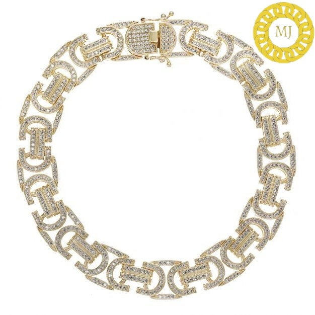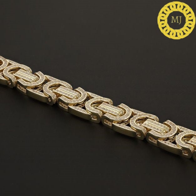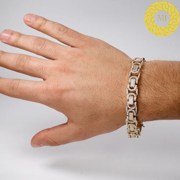 Heavy Solid 925 Sterling Silver | VVS1 Moissanite Diamonds Studded 12 mm flat Byzantine Bracelet | 18k Gold plated Iced Out Bracelet