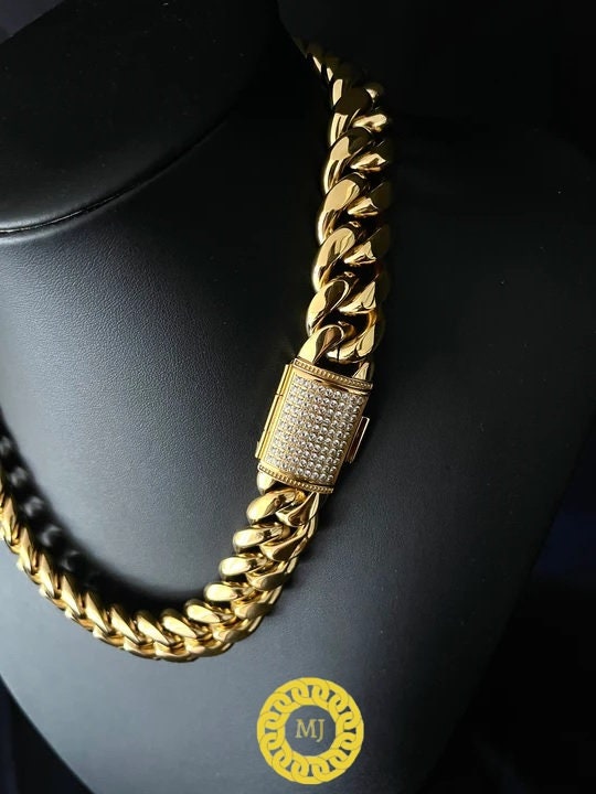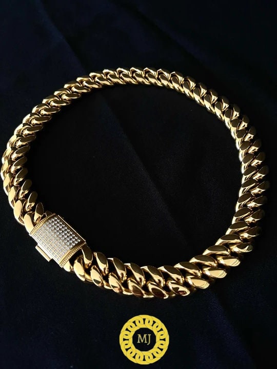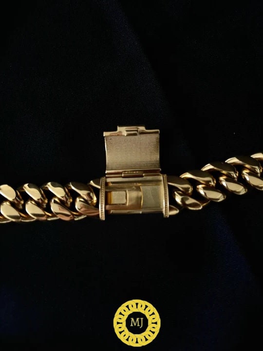 Our latest 18mm chain, a heavy durable chain with an icedout box clasp with prong set Moissonite diamond stones set and is finished in 18K Gold plate.