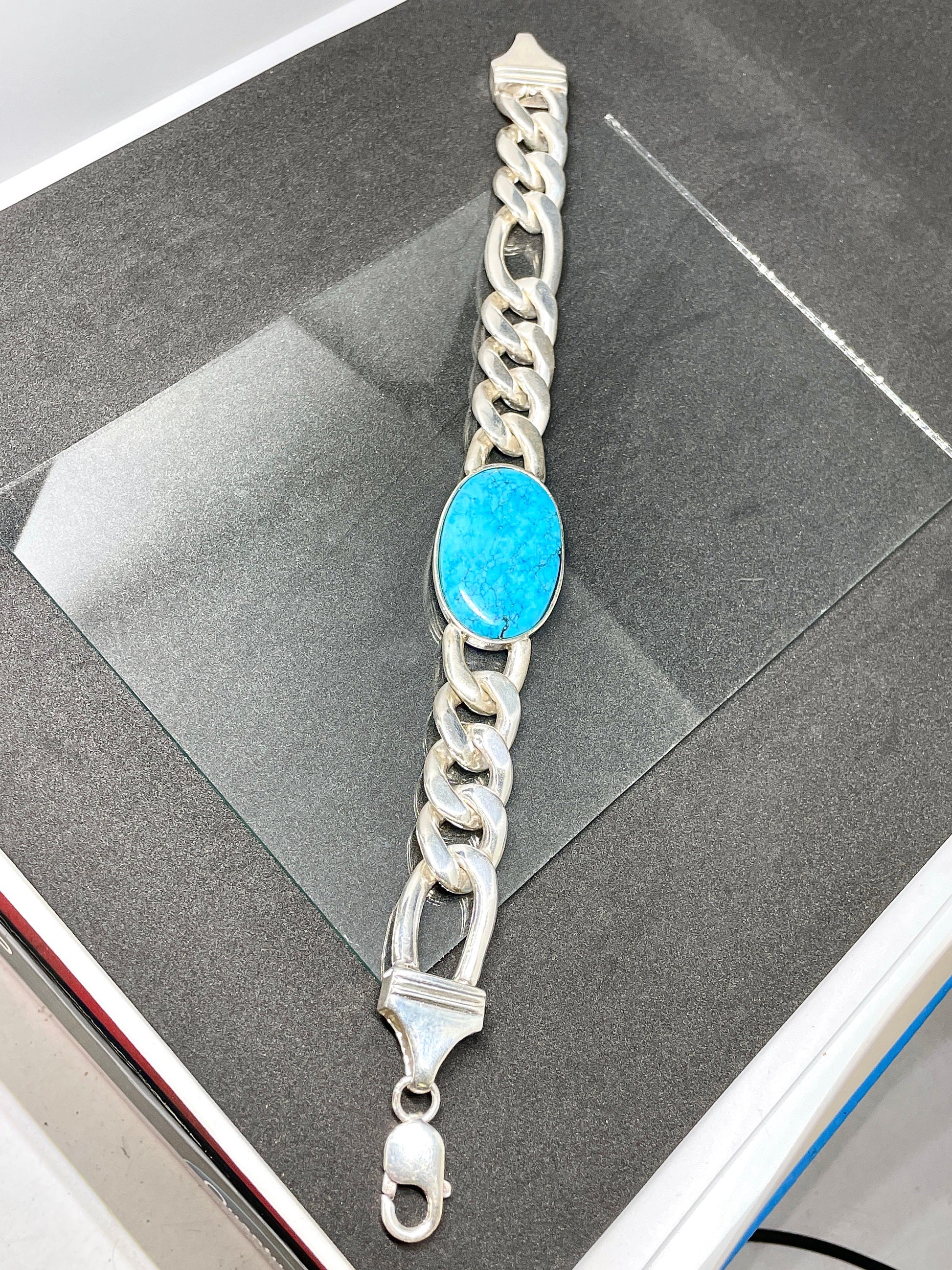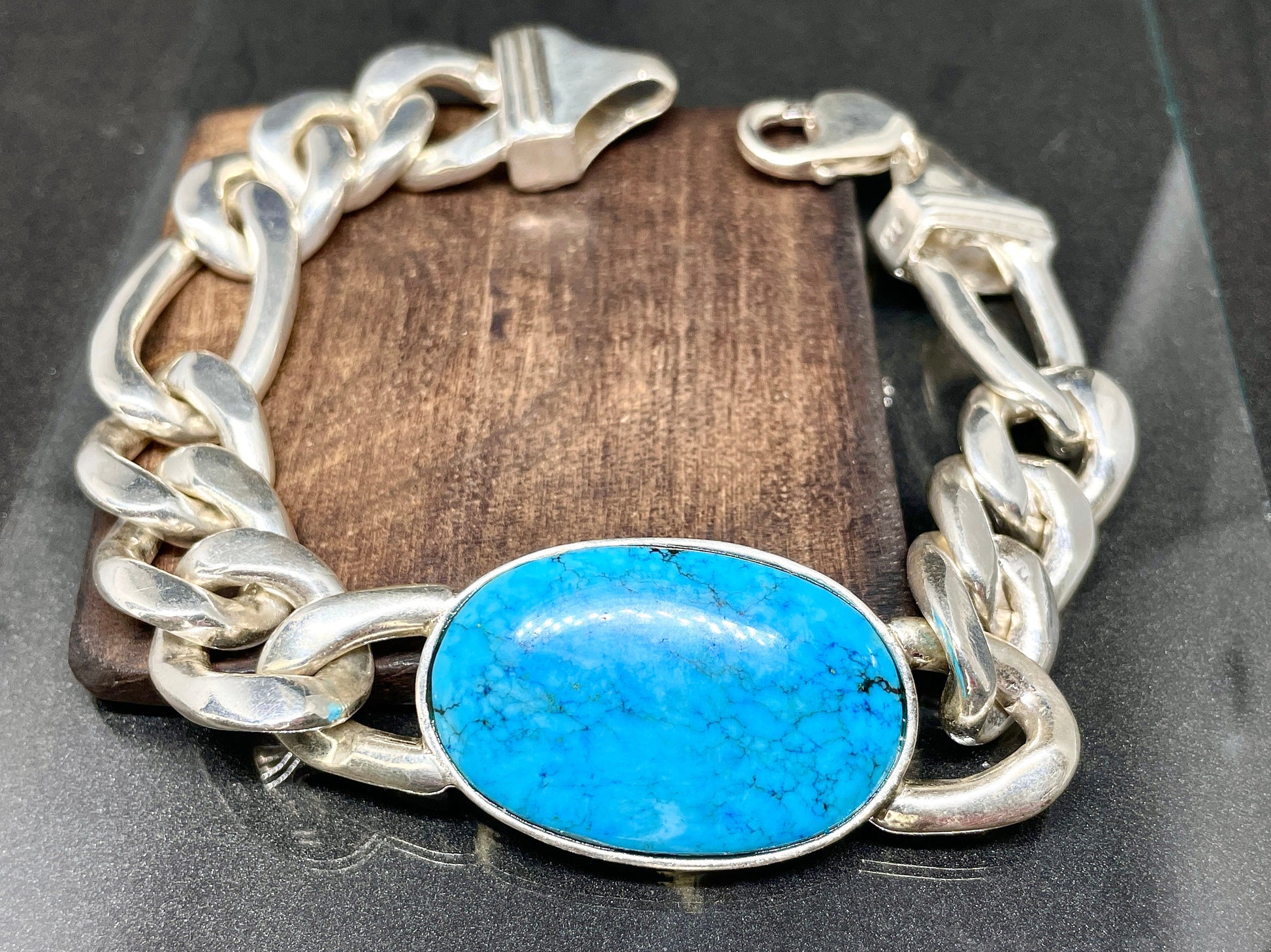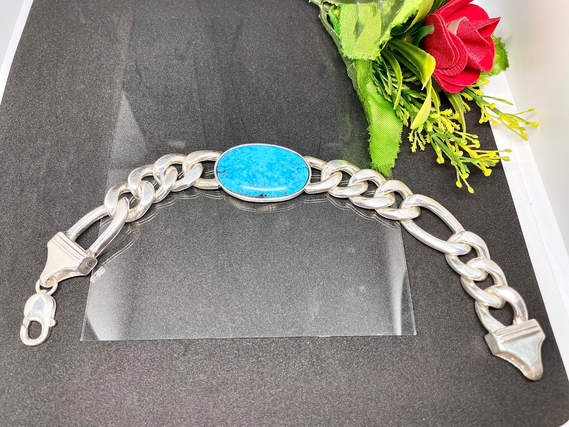 turquoise figaro Chain Bracelet, 925 Sterling Silver Cabochon Men's Jewelry December Birthstone,heavy Figaro silver Bracelet,Gifts for him