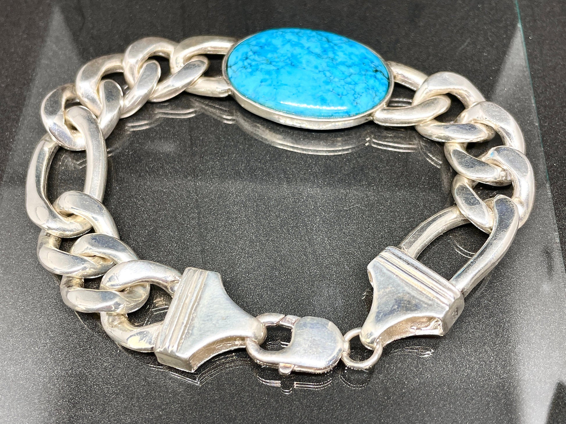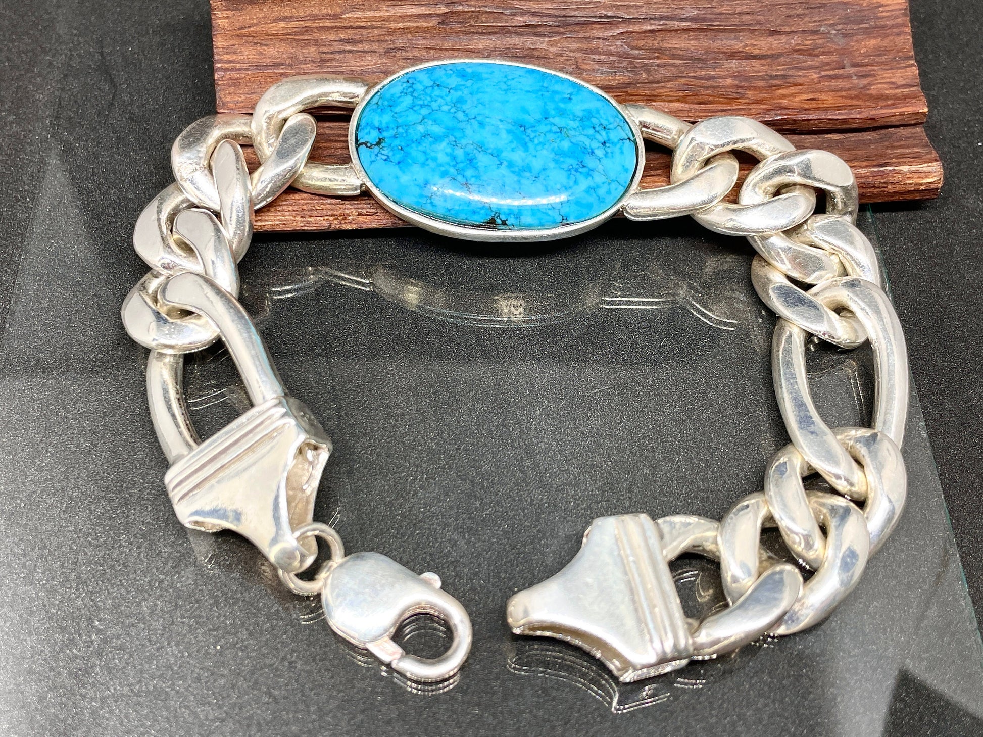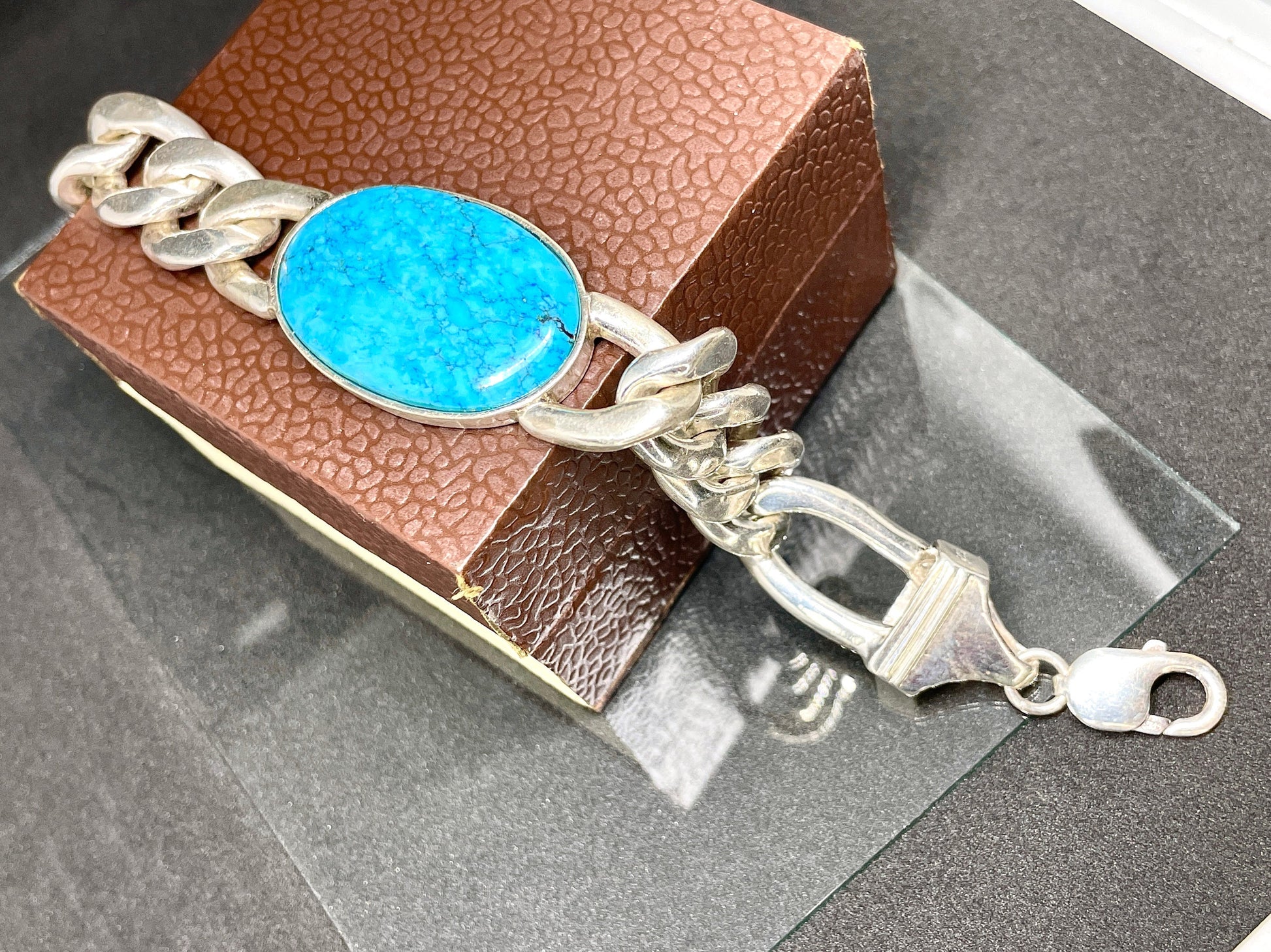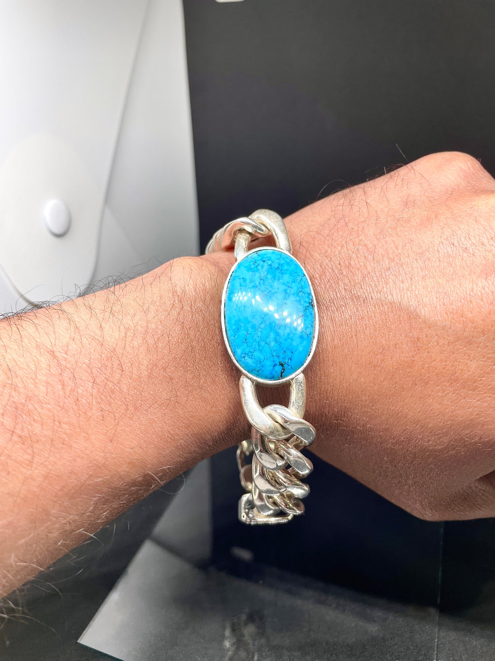 turquoise figaro Chain Bracelet, 925 Sterling Silver Cabochon Men's Jewelry December Birthstone,heavy Figaro silver Bracelet,Gifts for him